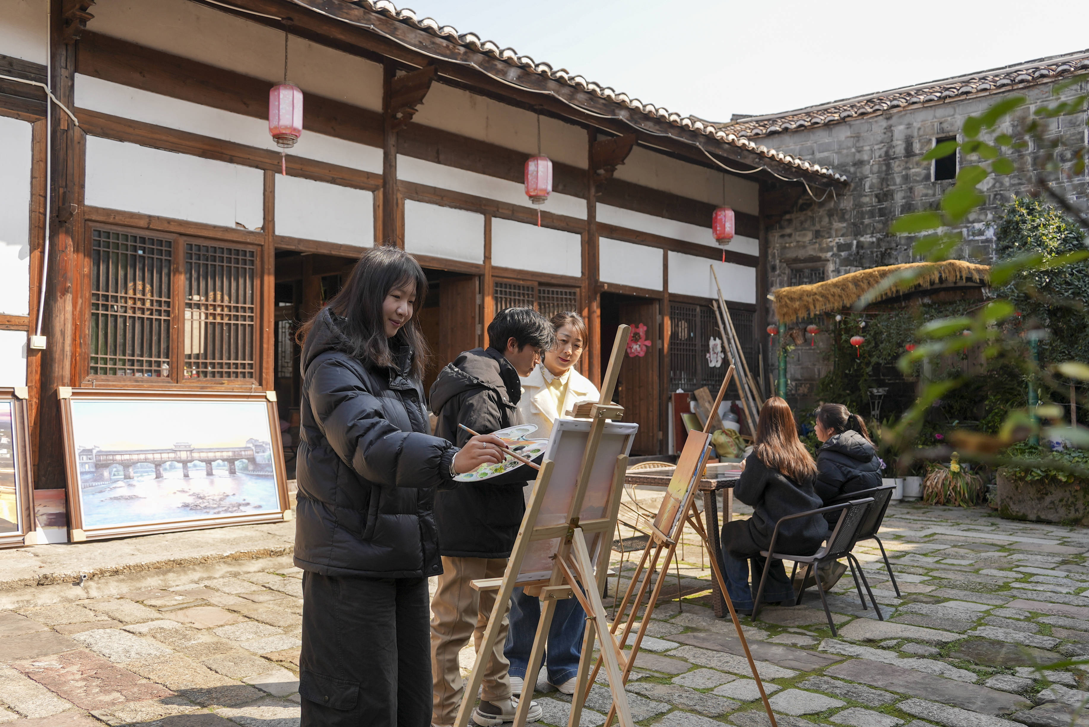 民宿的庭院里,画架一字排开,油彩铺陈,这家民宿春节期间推出的免费油画体验活动场场满员。来自上海的游客徐硕说:“以前过年就是走亲访友,今年带着父母和孩子出来旅行,一起完成一幅画,比单纯逛景区更有纪念意义。”