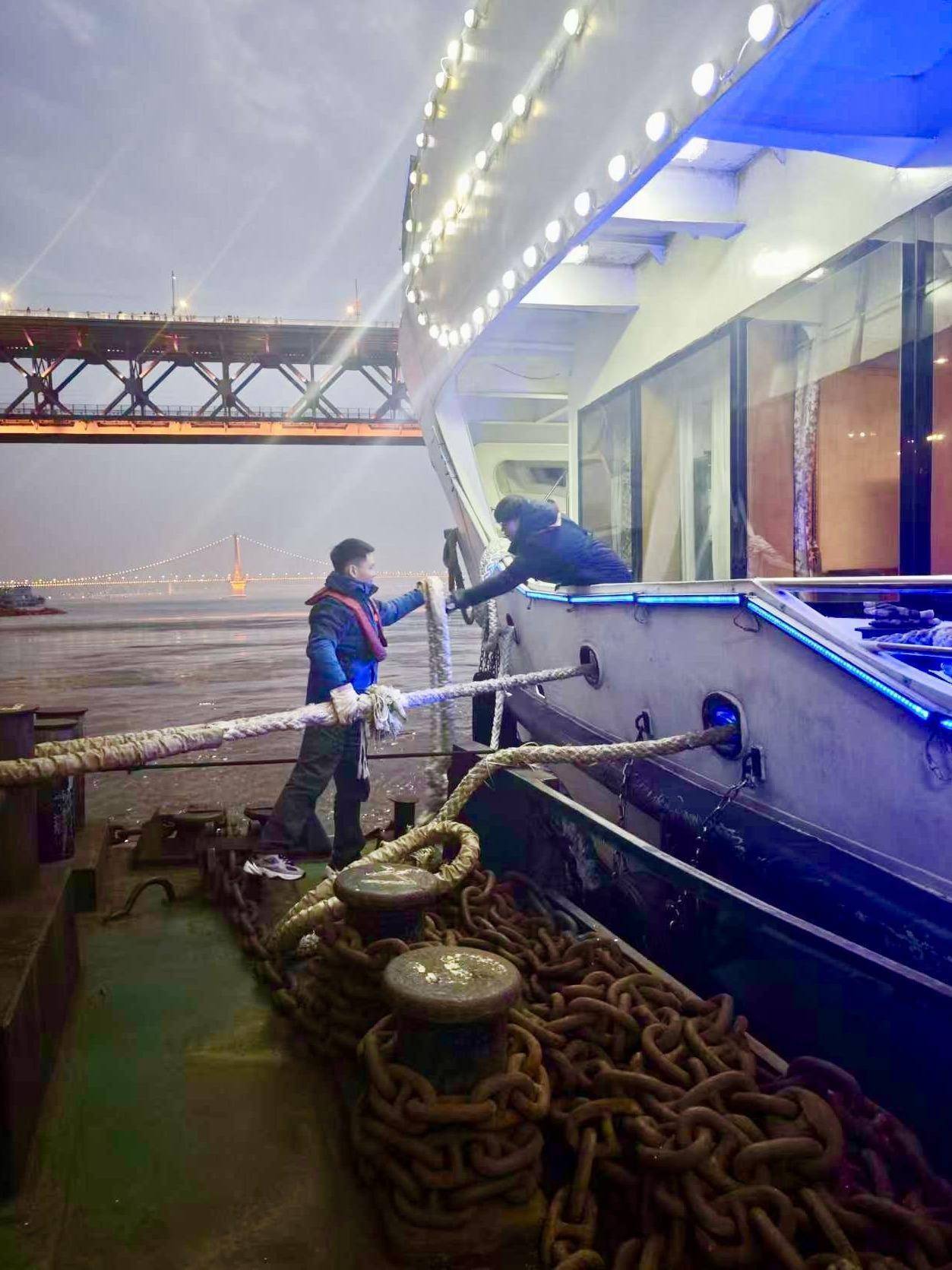 “您好,请问‘黄鹤楼号’大概什么时候开?”“附近有没有寄存行李的地方?”“洗手间怎么走?”面对候船游客的各种询问,胡麒麟耐心解答。大年初二,一位老人带着小孙子在候船厅等候,孩子突然哭闹起来,老人一时手足无措。胡麒麟看到后,立即上前询问,原来孩子有些晕船不适。他马上引导老人和孩子到通风处休息,并迅速取来温水。直到目送这家人平稳登船,他才放心地回到自己的岗位上继续值守缆绳。同事笑称他是“趸船上的一颗螺丝钉”,哪里需要哪里拧。他却说:“游客在码头上的每一分钟,都是我们的服务时间。接好缆绳是我的本分,让游客安心候船也是我的责任。”